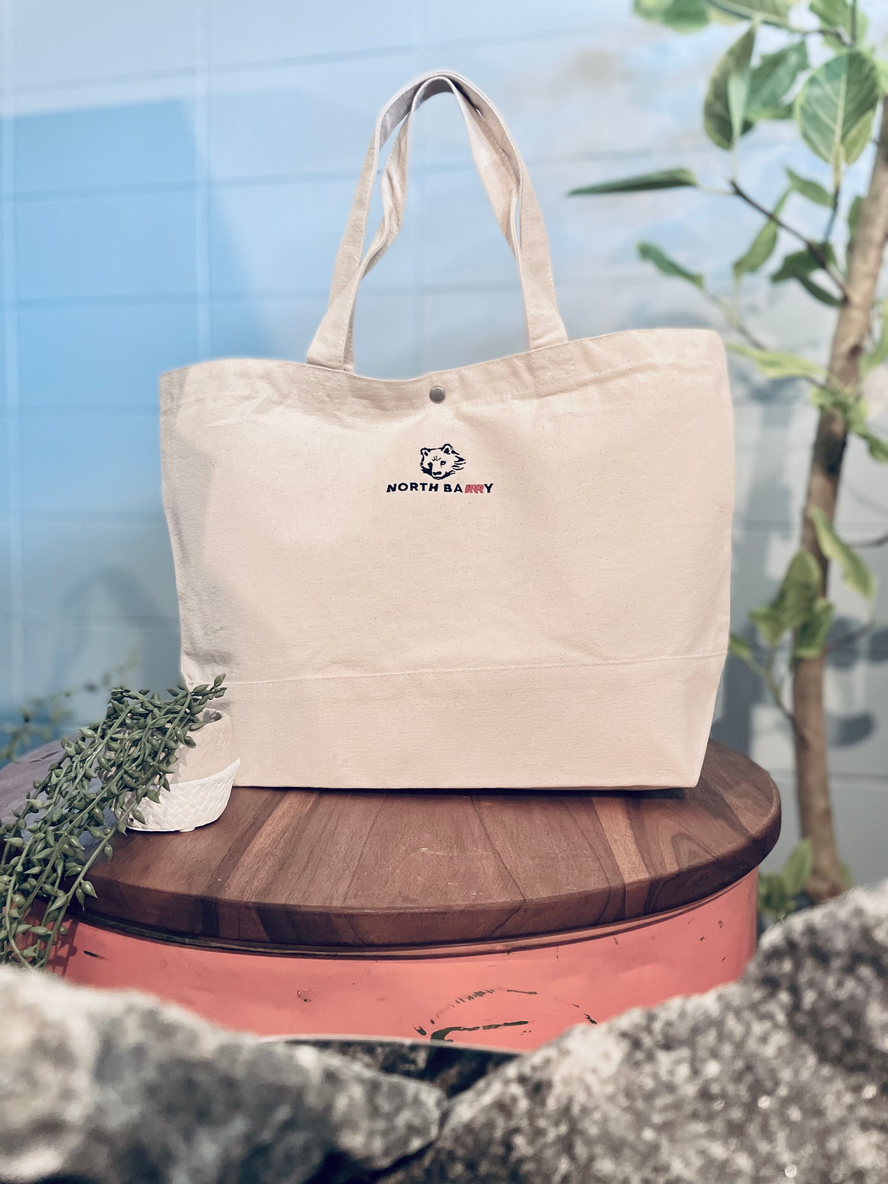 シンプルでかわいらしいデザインが特徴のトートバッグです。クマの顔がプリントされたロゴが目を引き、コーディネートのささやかなアクセントになります。
